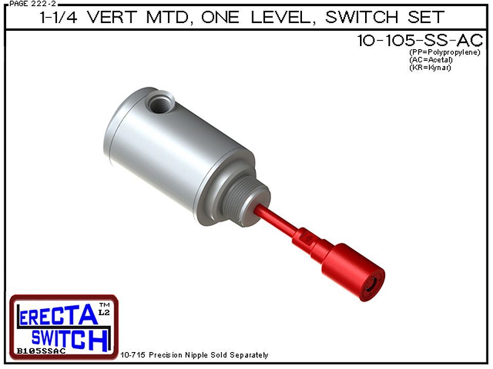 10-105-SS-AC 1-1/4″ NPT Relay Housing Vertical Mounted One Level extended Stem Shielded Level Switch Set (Acetal) features a 1-1/4″ NPT Relay Housing providing a liquid tight chamber for your control relay or wire splices. Housing includes an upper chamber with screw on lid to access external wiring and 1/2 NPT female boss for conduit connection. The innovative snap on slosh shield dampens turbulence from agitation, proximity to tank filling etc… and protects the level switch during installation and removal. liquid level switch set includes everything except the 10-715-PP-XX precision nipple.10-715-PP-XX nipple is available in 1 inch increments from 1 – 70 inches. This item is sometimes referred to as a water level switch, float switch, or magnetic level switch.