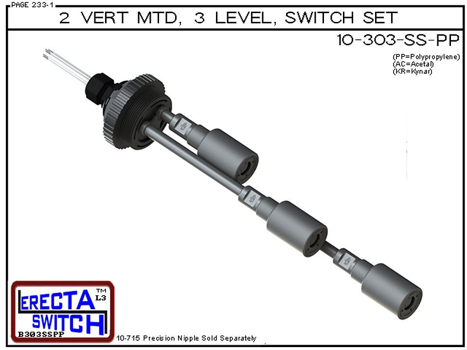 10-303-SS-PP 2″ NPT Shielded 3 Level Drum Float Switch Set (Polypropylene) features a 1-1/4″ NPT wiring receptacle providing a weather tight chamber for wire splices, a 2″ NPT adapter, extended stem hardware and slosh shields. The receptacle cap has a 1/2″ center knock out and the multi level switch set provides a liquid tight strain relief connector. The innovative snap on slosh shields dampen turbulence from agitation, proximity to tank filling etc… and protect the liquid level switches during installation and removal. Multi Level Switch Set includes everything except the 10-715-PP-XX precision nipples.10-715-PP-XX nipples are available in 1 inch increments from 1 – 70 inches. This Multi Level Switch set is great for differential level sensing in drum applications or any 2″ NPT female boss.This OEM Level Switch set is great for easy mounting on screw on tank lids and thin bulk heads. This item is sometimes referred to as a water level switch, float switch, or magnetic level switch.