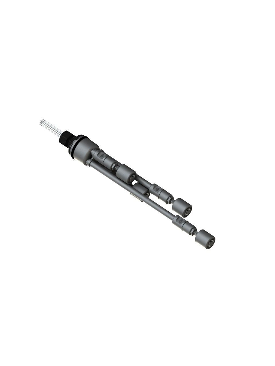 10-408-PP Pop-In Four Level Extended Stem Shielded Multi Level Switch Set features our unique Pop-in wiring receptacle providing a weather tight chamber for wire splices. The Pop-In receptacle cap has a 1/2″ center knock out and Multi Level Switch set provides a liquid tight strain relief connector. The innovative snap on slosh shields dampen turbulence from agitation, proximity to tank filling etc… and protect the liquid level switches during installation and removal. Multi Level Switch Set includes everything except the 10-715-PP-XX precision nipples.10-715-PP-XX nipples are available in 1 inch increments from 1 – 70 inches. If you need differential level sensing in a tank with a thin plastic bulkhead or tank lid (.062-.078), just punch a 1-9/16″ hole and this this multi level switch set just pops right in.This item is sometimes referred to as a water level switch, float switch, or magnetic level switch.