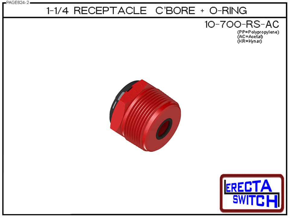 10-700-RS 1-1/4 NPT C’bore + O ring Wiring Receptacle is designed to provide a 1-1/4 NPT mount and a weather tight enclosure for wiring connections. C’Bore and O ring can be used with ERECTA SWITCH ¼ npt bulk head fittings to adapt to 1-1/4 NPT bulk head mount. Snap on cap features ½ inch center knock out to accommodate liquid tight strain relief connectors or other aftermarket connectors.