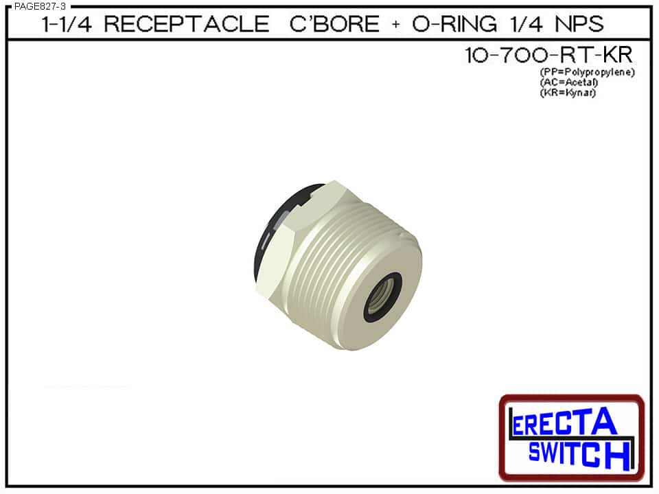 10-700-RT  1-1/4  NPT C’bore + O ring ¼ NPS Wiring Receptacle is designed to provide a 1-1/4 NPT mount and a weather tight enclosure for wiring connections. C’Bore and O ring ¼ NPS can be used with ERECTA SWITCH ¼ npt bulk head fittings to adapt to 1-1/4 NPT bulk head mount. Snap on cap features ½ inch center knock out to accommodate liquid tight strain relief connectors or other after market connectors.