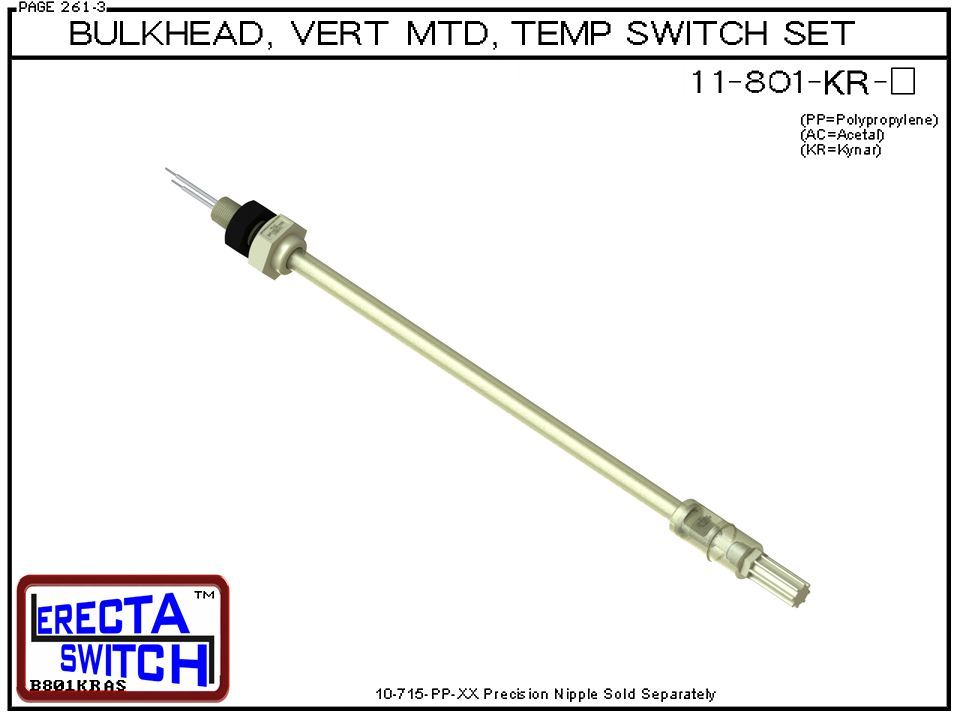 11-801-KR 1/4 Bulkhead Mounted Temperature Probe / Bi-Metallic Temperature Switch Set (PVDF Kynar). This temperature switch / temperature probe includes a 1/4 NPT Bulkhead fitting mount straight connector and 11-800 temperature switch. The temperature probe / Bi-Metallic temperature switch set is extended using 10-715 precision nipples (sold separately and available in 1 inch increments from 1″-70″).