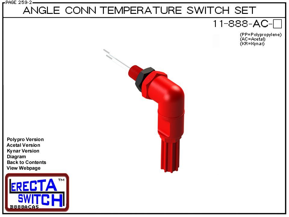 11-888-AC Bi-Metallic Angle Connector Mounted Temperature Switch Set (Acetal) adapts the 11-800 temperature switch to an angle mounted temperature switch. Set includes a temperature switch, angle connector, o rings and jam nut.