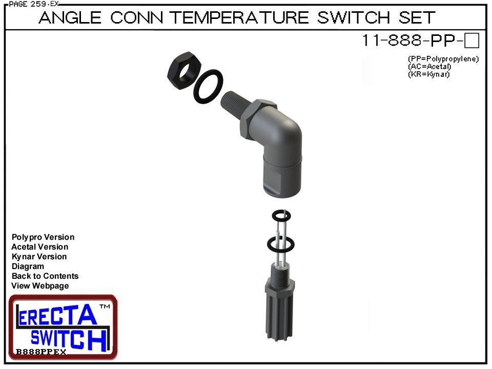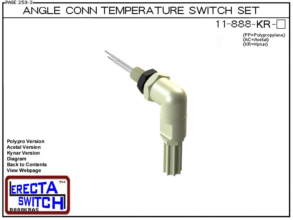 11-888-KR Bi-Metallic Angle Connector Mounted Temperature Switch Set (PVDF Kynar) adapts the 11-800 temperature switch to an angle mounted temperature switch. Set includes a temperature switch, angle connector, o rings and jam nut.