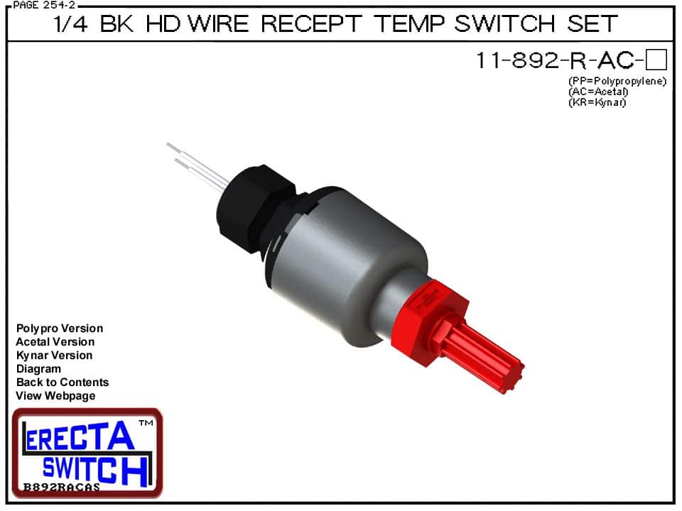 11-892-R-AC Bi-Metallic 1/4 Bulkhead Wire Receptacle Temperature Switch Set adds a weather tight wire receptacle to the 11-892 temperature switch set. The temperature switch sets innovative wire receptacle replaces the jam nut and provides a weather tight chamber for wire splices. The temperature switch set receptacle cap has a 1/2″ center knock out and accommodates included liquid tight strain relief connector. The temperature Switch seals to the bulkhead fitting with double o ring seal. Mount to an existing 1/4″ NPT female boss or drill a smooth hole and use the included jam nut and o ring.