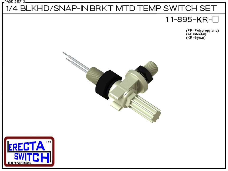 11-895-KR Bi-Metallic 1/4 Bulkhead /Snap-In Bracket Mounted Temperature Switch Set (PVDF Kynar) Is useful for applying a temperature switch to an open tank. Just drill a smooth hole and install the temperature switch bracket to the side of the tank. The temperature switch then snaps into the temperature switch bracket.
