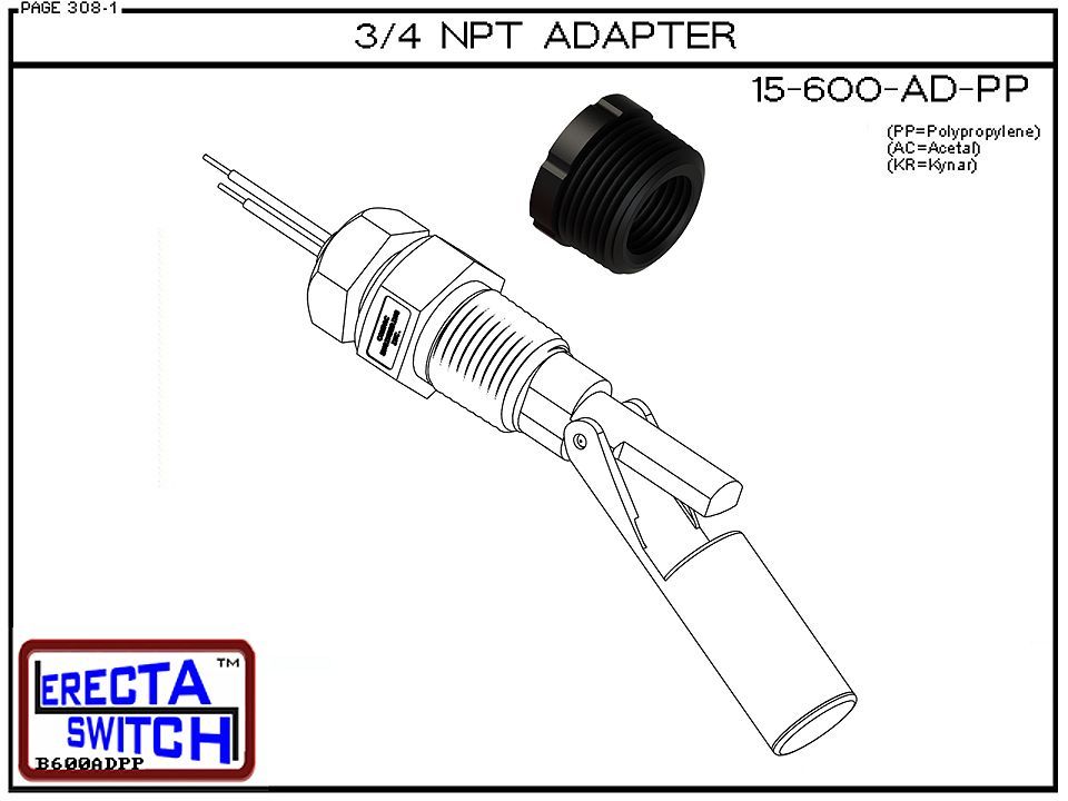 15-600-AD 3/4 NPT Adapter adapts all Series 15 level switches and switch sets 1/2 NPT male threads to outside in 3/4 NPT mounting. Polypropylene version is suitable for water, soaps , light acids.