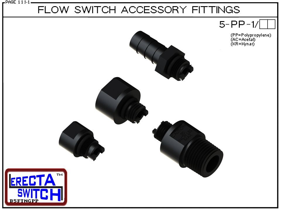 The 5-PP Flow Switch Accessory Fittings provide versatile thread adaptations for ERECTA SWITCH flow switches and indicators, making them compatible with a range of applications. These fittings are available in four threading options: